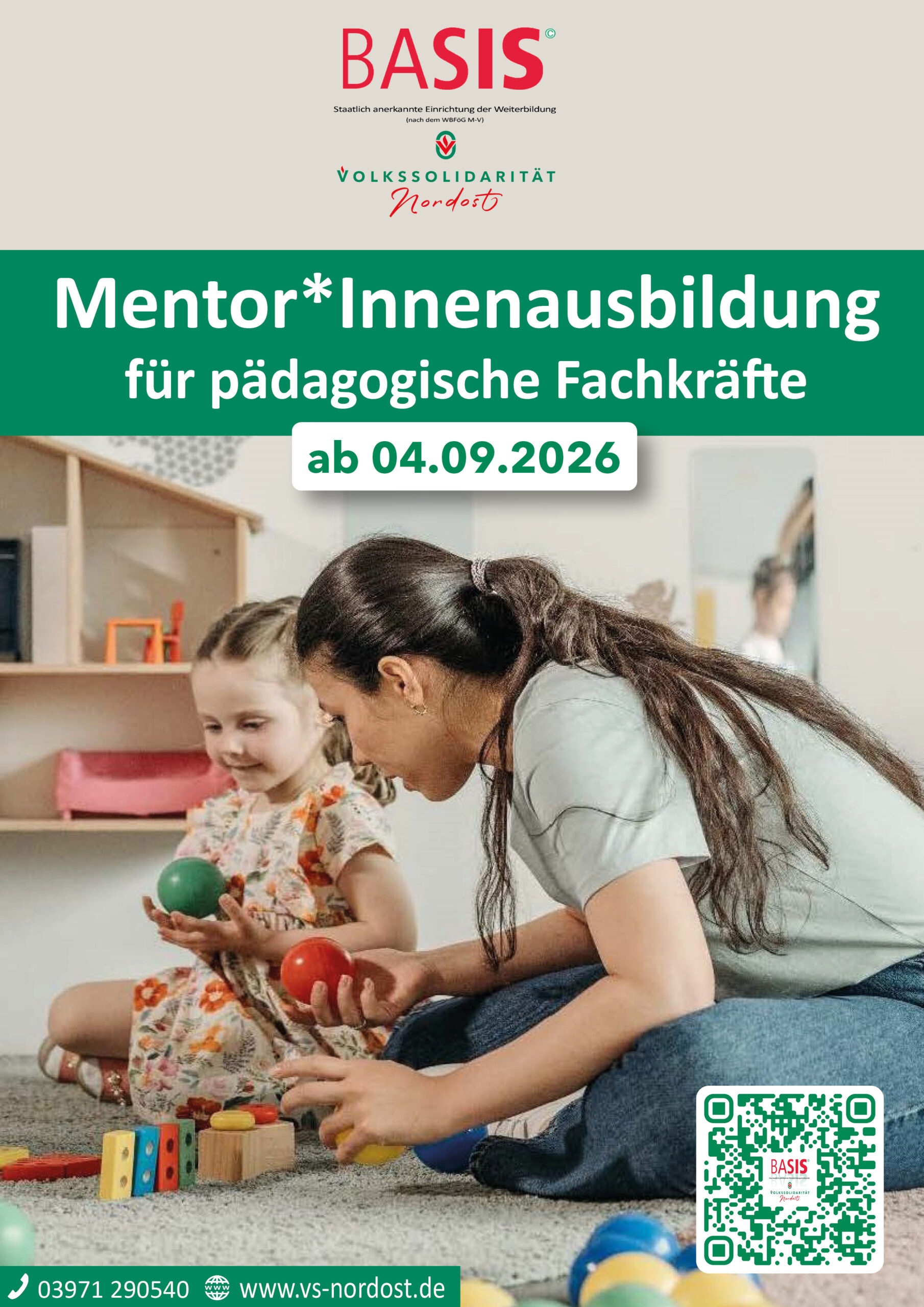 Die Volkssolidarität NORDOST e.V. ist Träger der staatlich anerkannten Einrichtung der Weiterbildung „BASIS“ (nach dem Weiterbildungsförderungsgesetz Mecklenburg-Vorpommern). Das Weiterbildungsangebot für das Jahr 2026 bietet ein abwechslungsreiches Programm, das den Weiterbildungsinteressen pädagogischer Fachkräfte der Kinder- und Jugendhilfe gerecht wird. Grundlegend für unsere Angebote sind das Kindertagesförderungsgesetz (KiföG M-V) und die Bildungskonzeption des Landes Mecklenburg-Vorpommern.